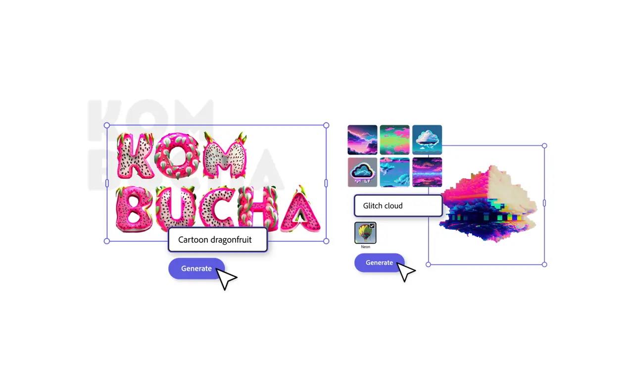 • Mit dem in Express integrierten Firefly können schnell benutzerdefinierte Bilder und Texteffekte aus Prompts in über 100 Sprachen erstellt werden, die für die kommerzielle Nutzung sicher gestaltet sind.