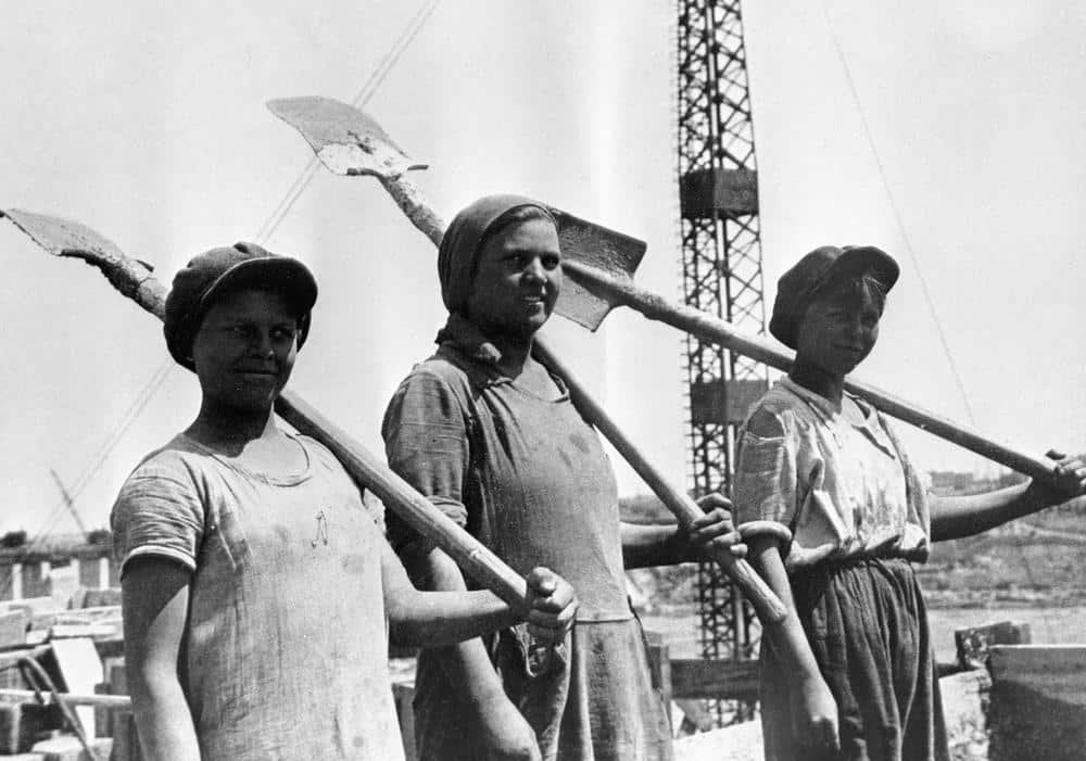 Rußland / Sowjetunion / Industrialisierung. Frauen-Brigade des Komsomol auf der Baustelle des DneproGes-Projektes (Staudamm und Wasserkraftwerk am Dnjepr in Saporoschje, Ukraine). Foto, 1931. © akg-images / SNA