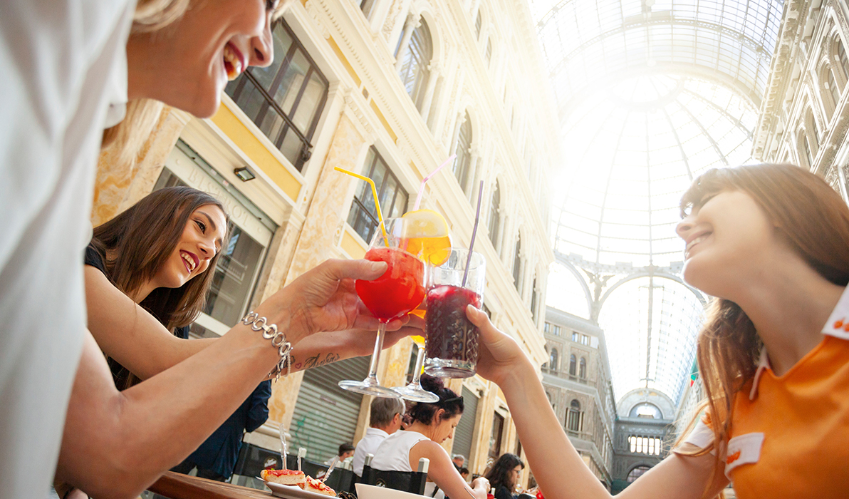 Friends do cheers with drinks in the gallery Umberto Primo in Naples. © Antonia Gravante/mauritius images