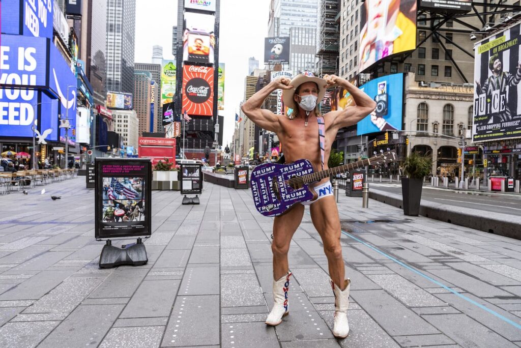 The Naked Cowboy alone in Times Square. New York City during the Corona Crisis March 19, 2020, Keep Going New York !! || A book by Stefan Falke New York during the pandemic 2020 Self published in 2021 62 pages, 58 color photographs New York City during the Corona Crisis in 2020. © Stefan Falke / laif