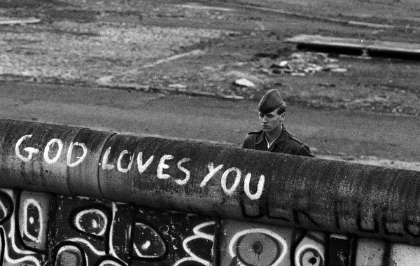 Berlin-City / Mitte / DDR / 6 / 1988 Potsdamer Platz: DDR-Grenzer schauen nach Westberlin. Dort haben junge Leute ein Stueck Niemandsland besetzt. Es liegt im Westen gehoert aber zum Osten. Die Westberliner Polizei ist gerade dabei zu raeumen. Der DDR-Grenzer weiss nicht, was auf der West-Seite der Mauer steht: -God loves you- // DDR-Mauer / Geschichte / Kommunismus / DDR-Staat © Paul Glaser