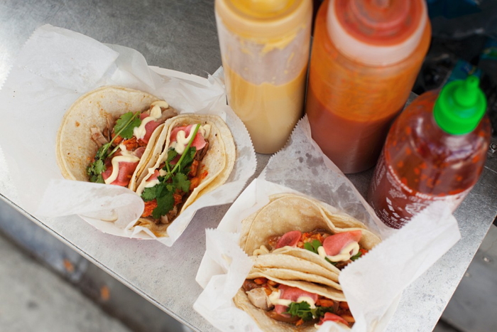 Beschreibung: Tacos mit Schweinebauch, scharfem Rettichsalat und Mayonaise (Bildnummer 11335990)
