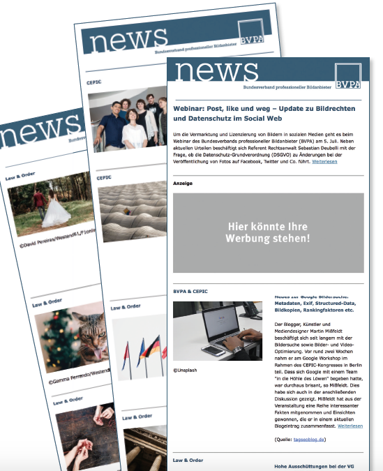 So weit, so neu – nicht geändert hat sich dagegen die Qualität der enthaltenen Beiträge sowie die wöchentliche Frequenz. Mit unseren BVPAnews erhalten Sie weiterhin den kompakten Bildbranchenüberblick zu aktuellen Urteilen, Analysen, Trends und Veranstaltungen. Jeden Mittwoch geht der Newsletter zuerst an die BVPA-Mitglieder, donnerstags, in reduzierter Form, an externe Newsletter-Abonnenten (u.a. Besucher unserer Veranstaltungen und Besteller der BVPA-Publikationen).