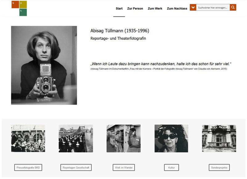 Zum 85. Geburtstag der Fotografin Abisag Tüllmann (1935-1996) startet die bpk-Bildagentur am 7. Oktober 2020 mit der neuen Abisag Tüllmann Website: www.bpk-archive.de/tuellmann/. Die Online-Präsentation bildet den Abschluss eines umfassenden Projektes. Mit finanzieller Unterstützung der Abisag Tüllmann Stiftung wurde der pressefotografische Nachlass Tüllmanns im Archiv der bpk-Bildagentur der Stiftung Preußischer Kulturbesitz in den vergangenen 3,5 Jahren erschlossen und digitalisiert.