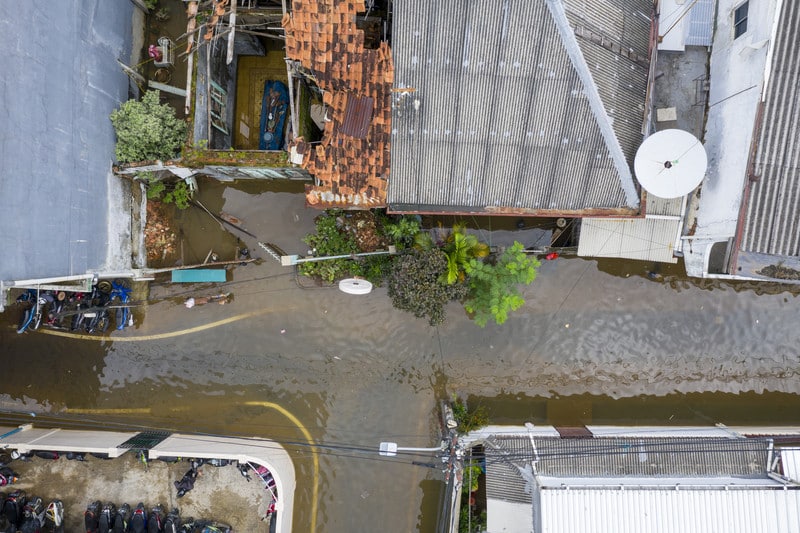 Jakarta, Indonesien, Ueberschwemmung, Anstieg des Meeresspiegels, Klimaveraenderung, Drohne, Wasser, Hausdaecher Engl.: Jakarta, Indonesia, flood, sea level rise, climate change, drone, water, house roofs © Nora Bibel/laif