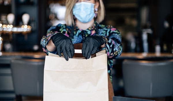 Woman At The Restaurant Door Giving Ready Food In A Paper Shopping Bag With – Takeaway In Coronavirus Outbreak Time © mauritius images