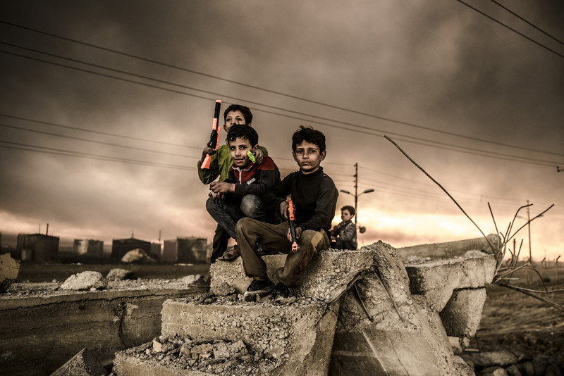 Iraq, Al Qayyarah, November 11. Iraqi boys play with toy guns in Al Qayyarah, northern Iraq. They are coated with black dust from the smoke of burning oil wells set alight by the Islamic State in August, 2016. The town is without electricity and running water. While Al Quayyarah has been liberated from the Islamic State it has become an environmental disaster, 11.11.2016 © Martyn Aim / laif