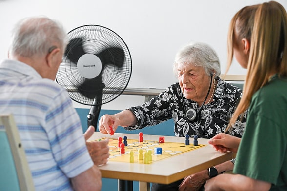 Bewohner spielen gemeinsam mit einer Pflegerin “Mensch ärgere Dich nicht” am 18. Juli 2024 im Sebastian-Dani-Alten- und Pflegeheim der Caritas in Bonn. Im Hintergrund läuft ein Ventilator. © Harald Oppitz/KNA