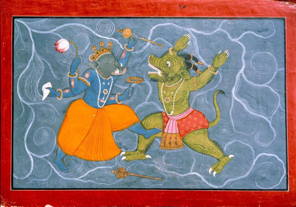 Indische Miniatur, Pahari-Schule, 2. Viertel 18. Jahrhundert, Malerfamilie Seu-Nainsukh. Varaha, der Eber, Inkarnation des Vishnu, im Kampf mit dem Dämon Hiranyaksha. (Illustration zum Bhagavata-Purana). Gouache auf Papier, 27,8 × 31,5 cm. Chandigarh, Museum. © akg-images / Jean-Louis Nou