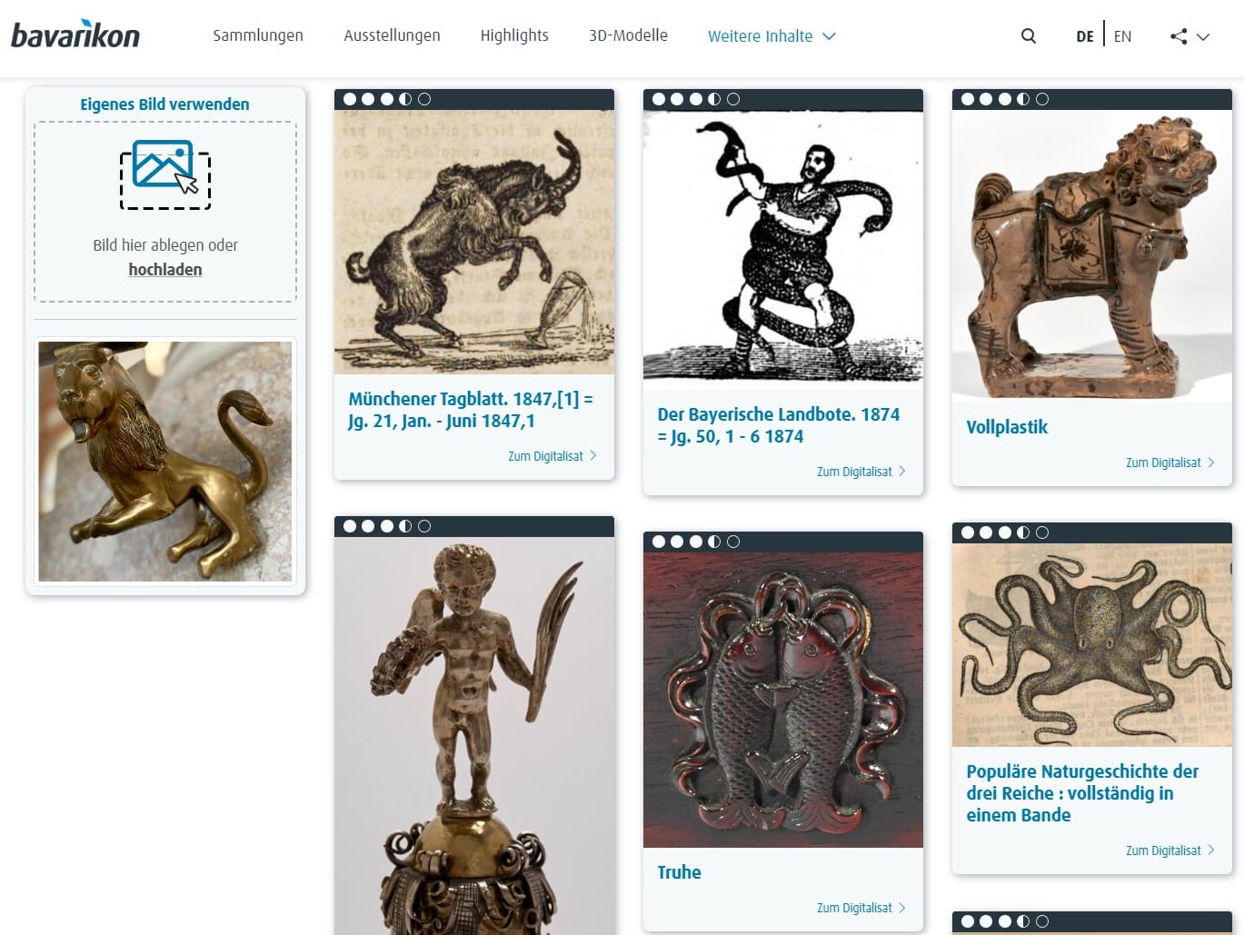 Die Bildrecherche wird mit dem neuen Such-Tool zu einem inspirierenden Erlebnis, denn es ergänzt die klassische Textsuche und geht weit darüber hinaus. Drei Suchmöglichkeiten stehen zur Auswahl: die Suche nach ähnlichen Bildern zu einem selbst hochgeladenen Bild, die Suche nach ähnlichen Bildern zu einem vorhandenen bavarikon-Objekt sowie verschiedene kuratierte Suchbeispiele, die in die Tiefen des bavarikon-Content führen.