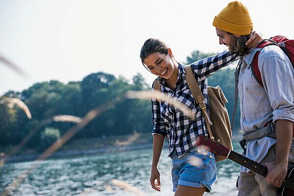 Couple enjoying a happy outdoor trek by the river with a guitar © mauritius images / Westend61 / Uwe Umstätter
