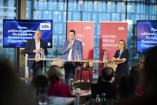 Wie lassen sich zentrale redaktionelle Workflows übersichtlich und effizient in einem Tool abbilden? Dieser Frage widmete sich eine Expert:innenrunde in einer „Breakout-Session“ am Mittwochnachmittag im Rahmen der Österreichischen Medientage 2025 in Wien. APA-IT-Geschäftsführer Clemens Prerovsky, APA-PictureDesk-Leiterin Luzia Strohmayer-Nacif und der stellvertretende APA-Chefredakteur Christian Kneil präsentierten die Lösungen für redaktionelle Inhaltserstellung, die die APA-Gruppe aktuell im Einsatz hat und kontinuierlich weiterentwickelt. Unter dem Titel „First by APA“ entsteht dabei ein 360-Grad-System für Newsrooms – sowohl in Medienhäusern als auch für Corporate Communication.