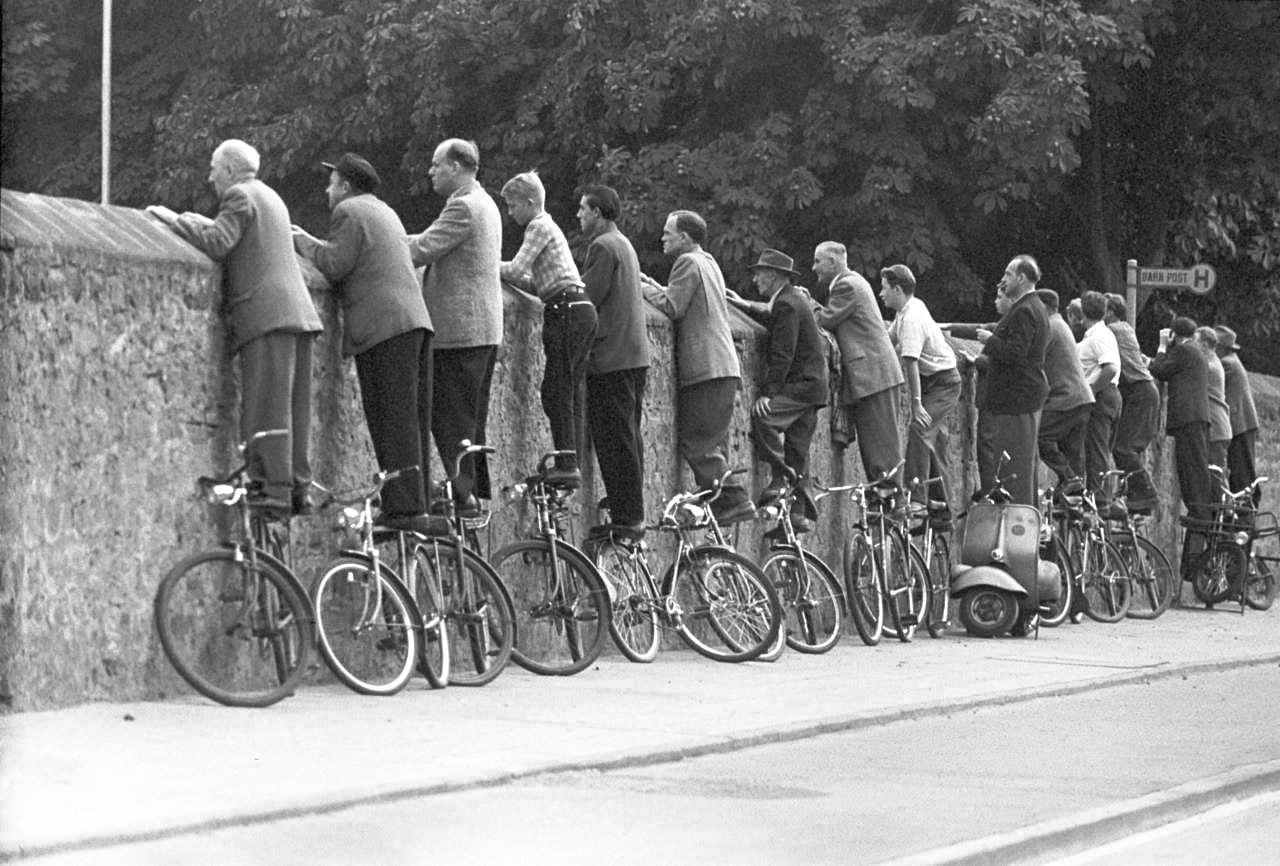 Ein paar Männer stehen im September 1958 bei Trier auf ihren Fahrrädern und schauen über eine Mauer auf einen Fußballplatz. Foto: picture alliance/dpa/Heinz-Jürgen Göttert