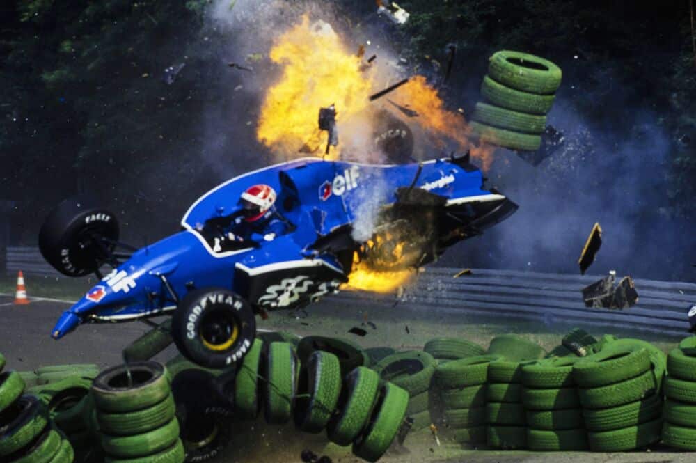1991 German GP HOCKENHEIMRING, GERMANY – JULY 28: Erik Comas, Ligier JS35B Lamborghini, crashes heavily during the German GP at Hockenheimring on July 28, 1991 in Hockenheimring, Germany. © Ercole Colombo/imago images