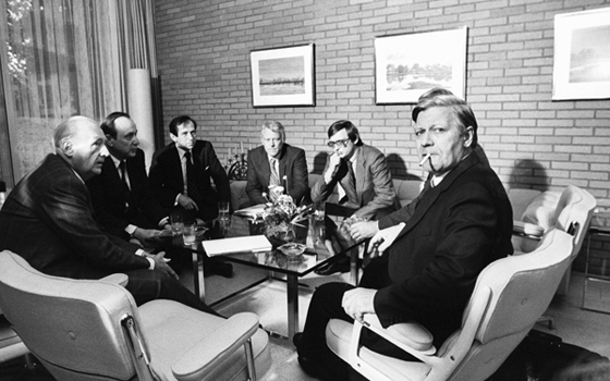 DEUTSCHLAND, BONN, 17.09.1969 Erstes Koalitionsgespräch zwischen Helmut SCHMIDT und Willy BRANDT ( SPD ) mit Hans-Dietrich GENSCHER und Günter Verheugen ( FDP ) im Kanzlerbungalow. © Ulrich Baumgarten