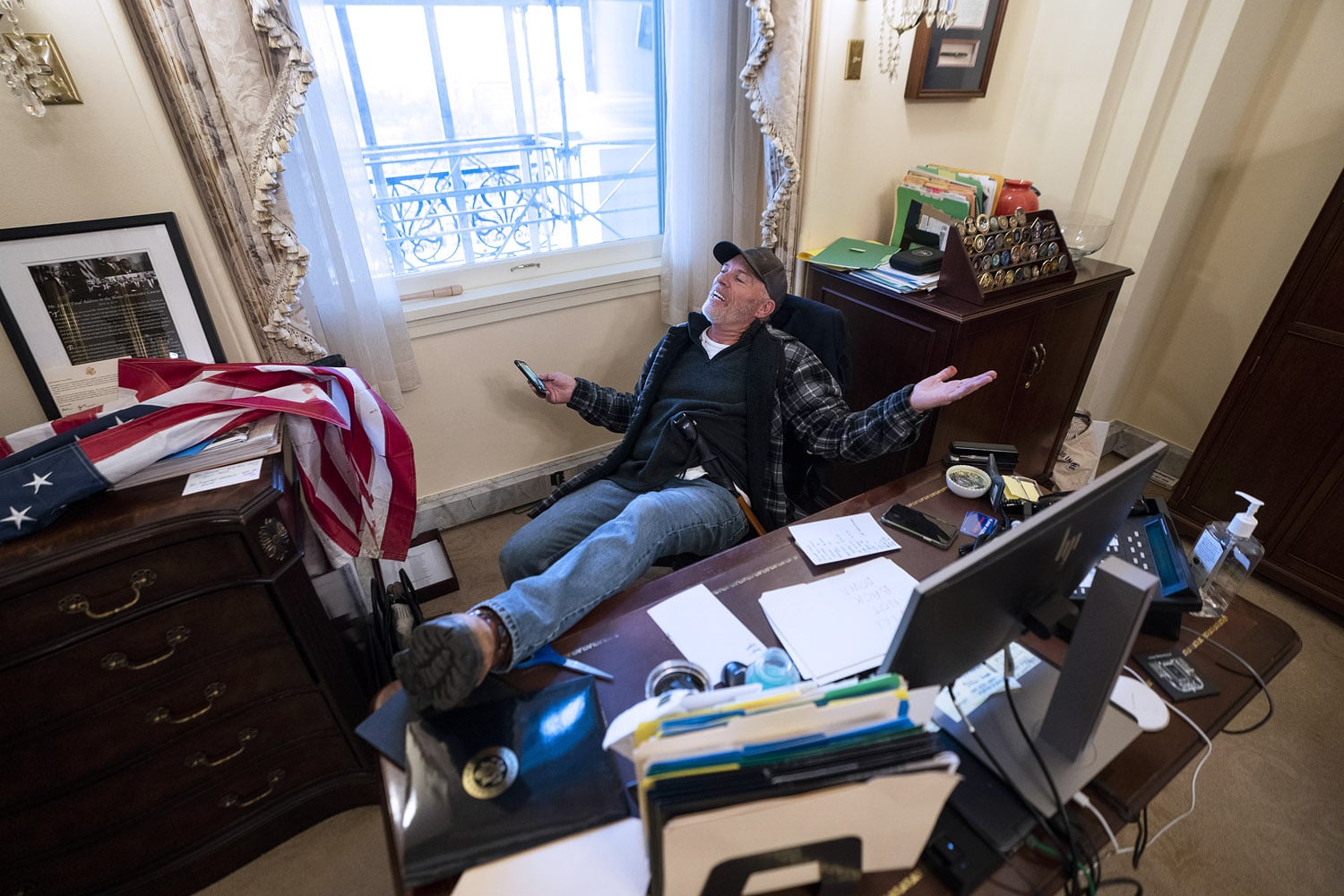 Bildunterschrift: Ein Trump-Anhänger sitzt beim Sturm auf das US-Kapitol am 06.01.2021 am Schreibtisch der Sprecherin des Repräsentantenhauses Nancy Pelosi in Washington, USA. Foto: picture alliance/ epa/ Jim Lo Scalzo