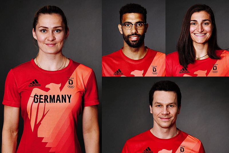 Bildkomposition mit Porträts des Team Deutschland für die Olympischen Spiele in Tokio. Zu sehen sind: Sophie Koch (Kanu), Patrick Dogue (Moderner Fünfkampf), Rebecca Langrehr (Moderner Fünfkampf), Patrick Hausding (Wasserspringen). Fotos: picture alliance/ Frank May.