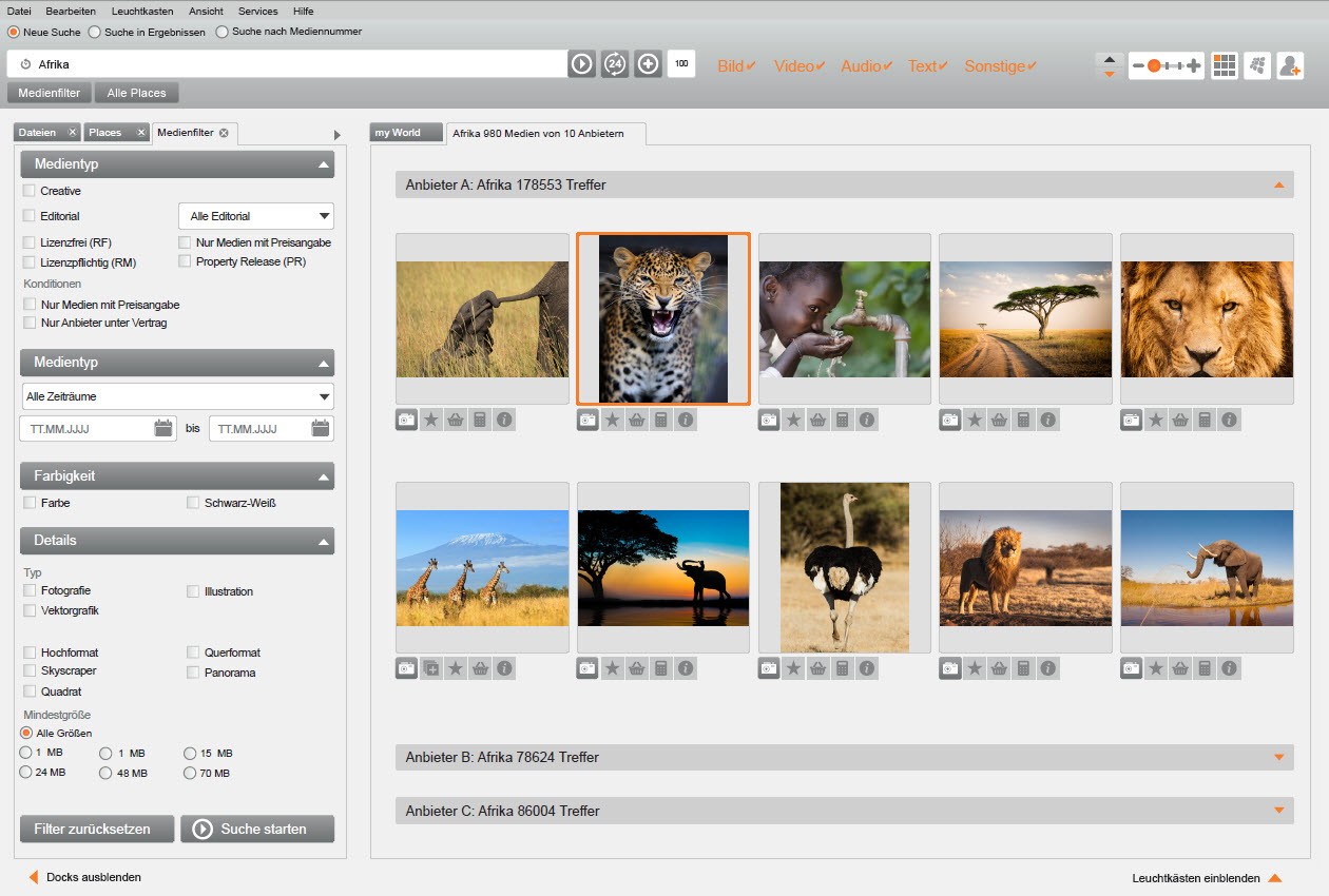 In my-picturemaxx werden bei einer Anfrage die Ergebnisse aller Bildagenturen und weiterer Medienquellen zusammen im Suchergebnis aufgelistet.
