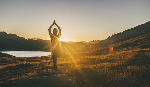Yoga in den Bergen, Meditation bei Sonnenaufgang © Raphael Meyer / mauritius images