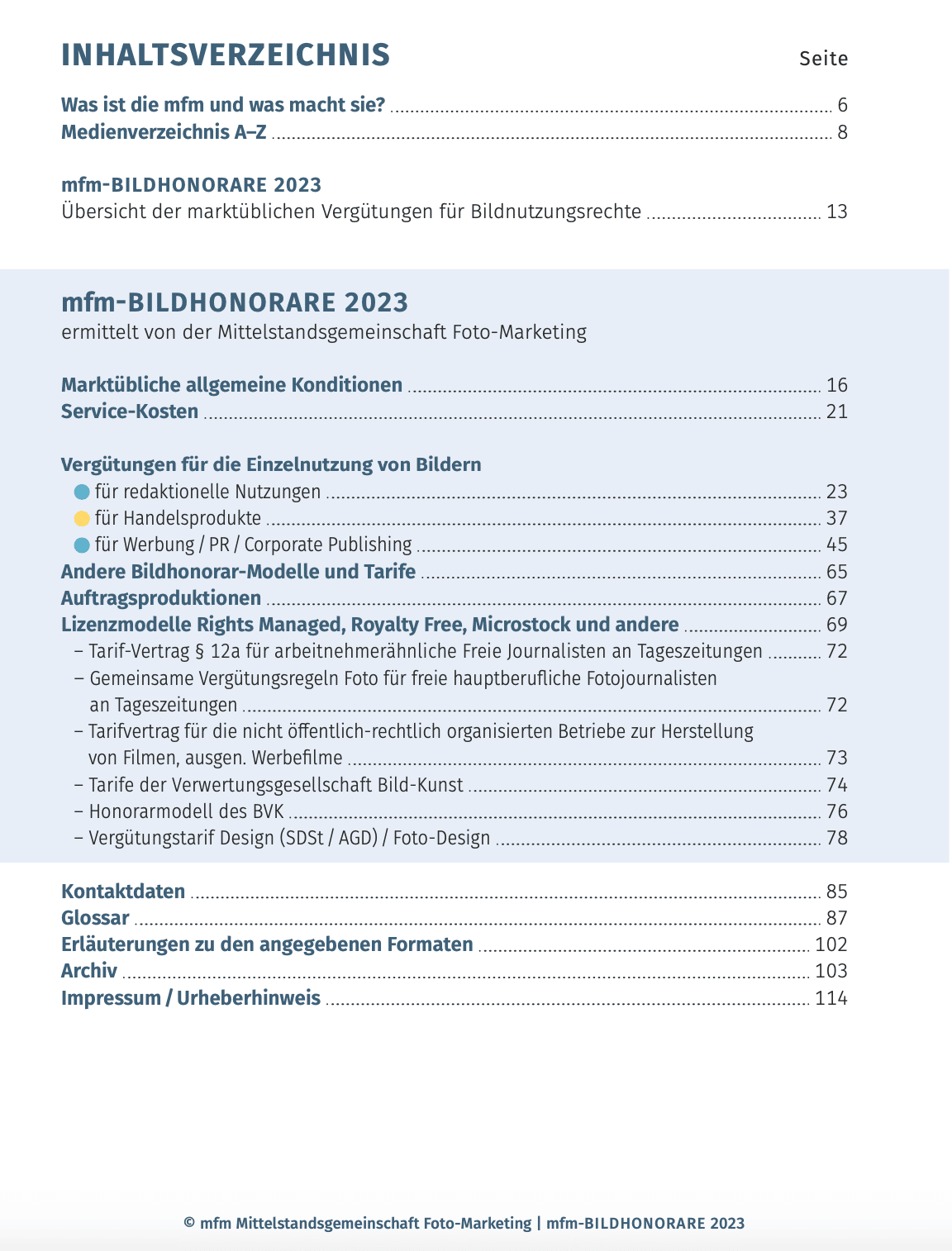 Unter Beteiligung der großen deutschen Fotografie-Verbände ermittelt die Mittelstandsgemeinschaft Foto-Marketing (mfm) jährlich die marktüblichen Honorare für Fotonutzungen. Die Ergebnisse fließen in die Broschüre BILDHONORARE ein, welche nun in der Ausgabe 2023 erschienen ist.