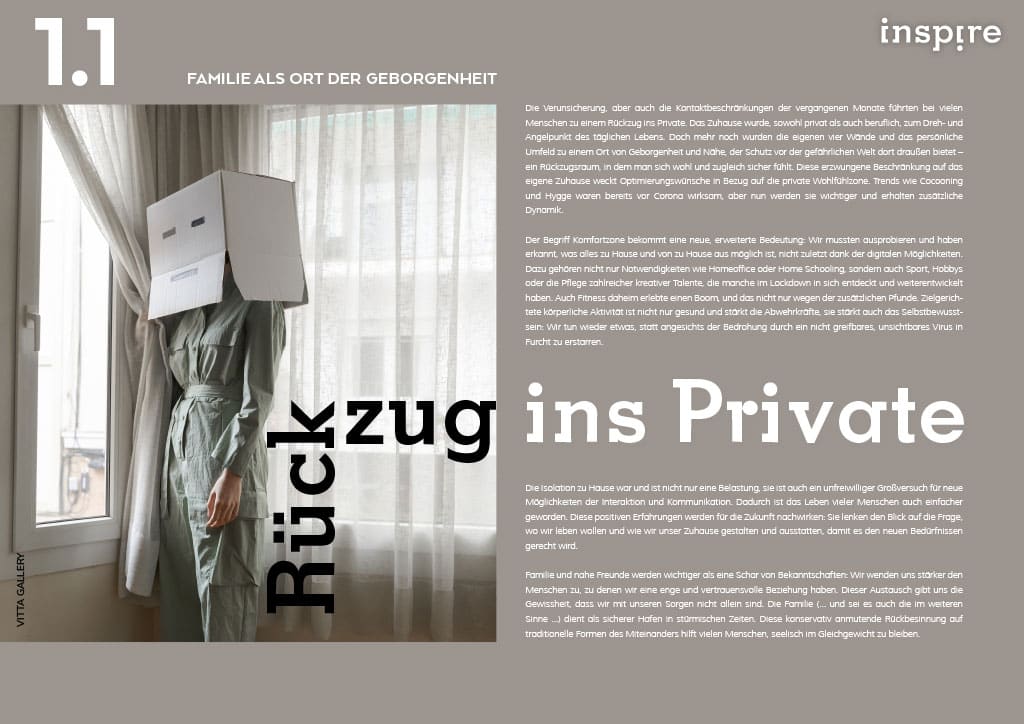 Das rund 40-seitige PDF behandelt die direkten Folgen der Pandemie, wie z.B. den Rückzug ins Private oder New Work im Home Office, lenkt unseren Fokus aber auch auf positive Entwicklungen wie mehr „Achtsamkeit“ und „Virtualität.“ Auch im Jahr 2021 werden die Auswirkungen der Pandemie unser gesamtes kreatives Potenzial, unsere „Krisen-Kreativität fordern, um das Leben im Lockdown zu bewältigen.