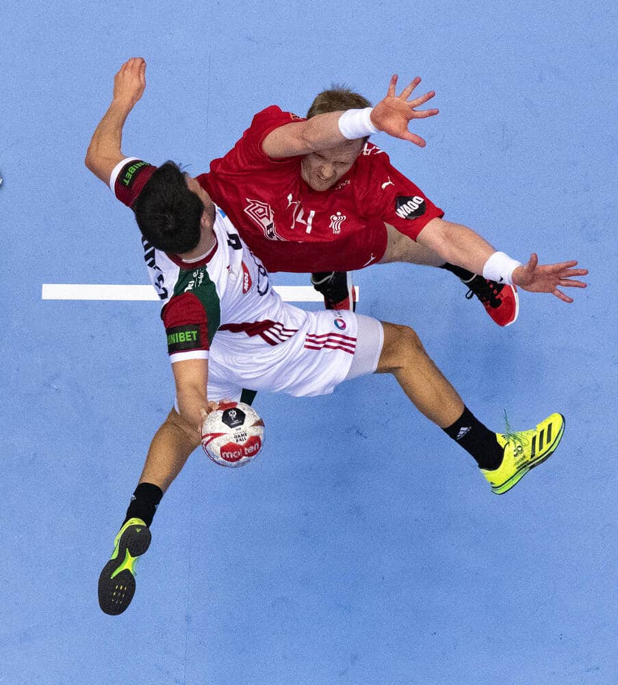 Das prämierte Sportfoto von Lars Moeller zeigt in der Vogelperspektive, wie Handballer Anders Zachariassen aus Dänemark einen Schuss von Gegner Adam Juhasz aus Ungarn entschlossen blockt, während des Hauptrundenspiels der IHF-Handball-Weltmeisterschaft 2019 in Jyske Bank Boxen, Herning, Dänemark. Dänemark gewann das Match mit 25-22 und ging somit ungeschlagen im kompletten Turnier als Sieger der Handball-Weltmeisterschaft hervor.
